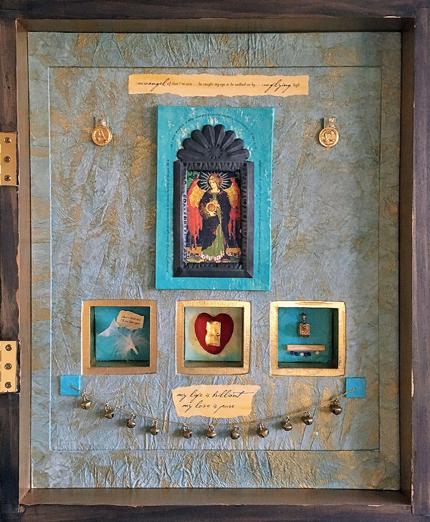 The reliquary — traditionally a container for holy objects — was a mixed-media collage I had created. Within the shadowbox frame was a painting of an angel, decorated panels, pieces of a poem, and symbols: an alpha and omega, a feather, a heart. An artist herself, my client asked about the piece, and I told her the story of lost love and deep sadness that had inspired it.